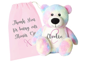 Personalised flowergirl flower girl thank you gift - rainbow tie dye teddy bear & bag GIFT SET - initial print